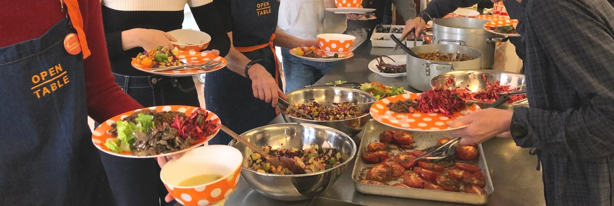 All meals are shared in an open and inclusive environment, where volunteers and diners of all ages and cultural backgrounds sit together for a meal at our open table. Our volunteers create a varied vegetarian menu all from donated food that would otherwise be wasted. In addition we offer free fresh produce hampers anyone to take home, as well as take away meals.